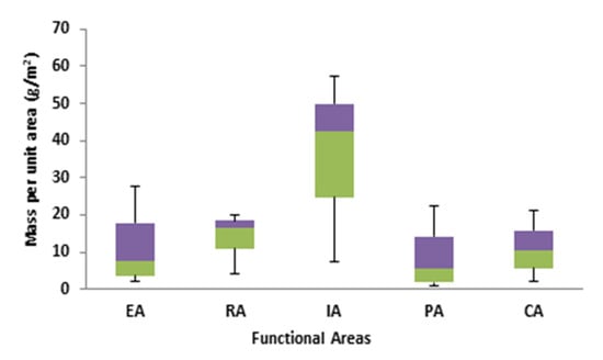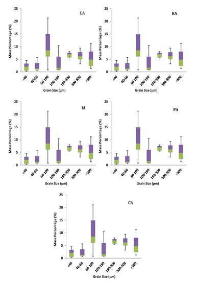 There were significant variations in the RDS particle size distribution across various functional locations (Figure 6). Our site inspections revealed that the IA and CA had large amounts of bare soil or cracked and rough road surfaces, indicating that they were contaminated. While brooms are frequently used to sweep the streets in the IA and CA, in metropolitan areas, motorized sweepers, which have greater RDS removal efficiency, are employed.