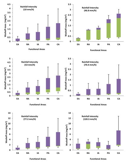 The transport factors investigated in this research were chosen primarily for their ability to alter surface runoff, which in turn affects the RDS index. The transport variables in the RDS index were represented by the proportion of each RDS particle size washed off the surface (Fwi), and the Fwi observed values ranged from 0.99% to 77.21%. Using the Fwi observed values, the amount of wash-off was determined for each of the RDS size fractions by changing the quantities and particle size compositions in the RDS to correspond to those in the sampling areas []. Figure 7 illustrates the RDS wash-off quantities along the functional areas. Increases in rainfall intensity increased the number of particles washed off per unit area, but wash-off as a percentage of RDS was reduced throughout all the functional areas.