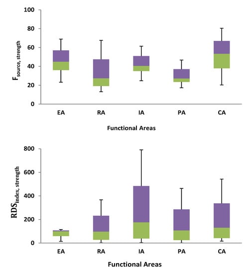 Equation (10) was used to generate the RDS index for pollution strength based on the weighted values of the source and transport factors. Equations (8) and (9) were used to calculate the Fsource,strength and Ftransport,strength.