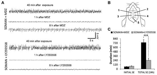 Soman (pinacolyl methylphosphonofluoridate) was obtained from Edgewood Chemical Biological Center (Aberdeen Proving Ground, MD, USA); it was diluted in cold saline and administered via a single subcutaneous injection (132 µg/kg, 1.2 × LD50). To alleviate the peripheral effects of soman we injected the rats with 2 mg/kg atropine sulfate (IM; Sigma-Aldrich, St. Louis, MO, USA), a muscarinic receptor antagonist, and 125 mg/kg HI-6 (IP; Starks Associates, Buffalo, NY, USA), a bispyridinium oxime that reactivates inhibited AChE, primarily in the periphery [], within 1 min after injection of soman. One hour after the soman exposure, the rats were injected (IM) with either MDZ (5 mg/kg; Hospira Inc., Lake Forest, IL, USA) or LY293558 (10 mg/kg; kindly provided by Raptor Pharmaceutical Corp., Novato, CA, USA). In deciding the appropriate anticonvulsant dose to use, we aimed for the lowest dose that will completely stop seizure activity in less than 30 min (Figure S1), as high anticonvulsant doses may contribute to cardiorespiratory depression, particularly in an animal undergoing SE. In the present study, we did not use a group of rats that was exposed to soman but did not receive any anticonvulsant treatment because (1) we have obtained such data in previous studies [,,,,,,,] and, therefore, considered it unnecessary to have more animals experiencing prolonged, unalleviated SE; and (2) the focus of the present study was to compare the outcomes when soman-exposed rats are treated with LY293558 versus MDZ.