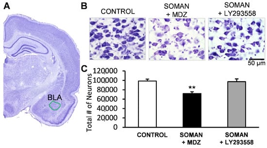 Thirty days after soman exposure, there was significant neuronal loss in the BLA of the MDZ-treated group but not the LY293558-treated group. (A) Panoramic view of a Nissl-stained section showing the area where neuronal loss was assessed; (Β) Representative photomicrographs from a control (not exposed) rat and an MDZ- or LY293558-treated soman-exposed rat (total magnification 630×; scale bar, 50 μm); (C) Group data; sample sizes: n = 8 for each group; ** p < 0.01 compared with either the control or the SOMAN + LY293558 group (ANOVA, Bonferroni post hoc test).