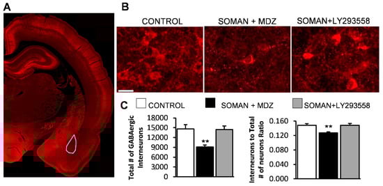 Thirty days after soman exposure, there was significant loss of GABAergic interneurons in the BLA of the MDZ-treated group but not the LY293558-treated group. (A) Panoramic view of a GAD-67 immuno-stained section showing the area where interneuronal loss was assessed; (B) Representative photomicrographs of GAD-67 immuno-stained interneurons in the BLA from a control (not exposed) rat and an MDZ- or LY293558-treated soman-exposed rat (total magnification 630×; scale bar, 50 μm); (C) Group data of the total number of GABAergic interneurons (left panel) and the ratio of the number of GABAergic interneurons to the total number of neurons (right) for the two experimental groups and a control group. Sample sizes: n = 8 for each group; ** p < 0.01 compared with either the control or the SOMAN + LY293558 group (ANOVA, Bonferroni post hoc test).