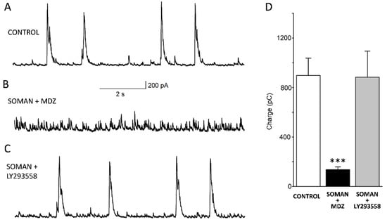 In the BLA of the control rats (not exposed to soman), the principal/pyramidal neurons generated synchronous “bursts” of GABAA receptor-mediated IPSCs (in 12 out of 14 neurons; Figure 4A), which is consistent with previous reports [,,,]. In the rats exposed to soman and treated with MDZ, this rhythmic synchronous inhibitory activity was absent at 30 days after exposure, in all of the recorded neurons (n = 14; Figure 4B). In contrast, the soman-exposed rats treated with LY293558, displayed bursts of sIPSCs (Figure 4C) in six out of eight neurons. To quantify the differences between the groups we calculated the total charge transferred (the area delimited by the inhibitory current and the baseline) in picocoulombs (pC), for a time window of 10 s; we included all of the recorded neurons in these comparisons, whether they generated rhythmic sIPSC bursts or displayed only conventional spontaneous inhibitory activity. The total charge transferred by the sIPSCs in the SOMAN + MDZ group (135.61 ± 22.18 pC; n = 14) was significantly different from that in the SOMAN + LY293558 group (883.45 ± 210.29; n = 8; p < 0.001) and a control group that was not exposed to soman (897.27 ± 139.36 pC; n = 14; Figure 4D). The total charge transferred by the sIPSCs in the SOMAN + LY293558 group did not differ from the control (p = 0.12).