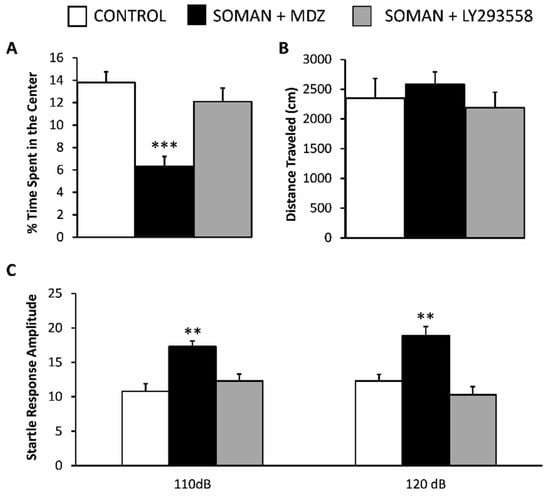 Thirty days after soman exposure, anxiety-like behavior was increased in the MDZ-treated group but not the LY293558-treated group. (A) Percentage of time spent in the center of the open field; (B) Distance traveled in the open field; (C) Amplitude of startle responses to 110- and 120-db acoustic stimuli. Sample sizes: n = 8 for each group. Control group is rats not exposed to soman. ** p < 0.01, *** p < 0.01 (One-Way ANOVA with Holm-Šídák post hoc test).