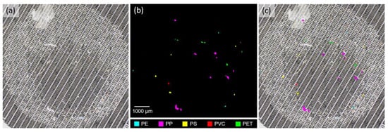 (a) Microplastics and other undigested matter extracted from human faeces on a stainless-steel sieve with 30 μm pores, (b) a two-dimensional array of colour-coded microplastics generated with an automated Raman mapping approach at a spatial resolution of 28.4 µm, and (c) the superimposed image of (a) and (b) to locate these particles, which were confirmed to be polyethylene (PE), polypropylene (PP), polystyrene (PS), polyvinyl chloride (PVC) and polyethylene terephthalate (PET).