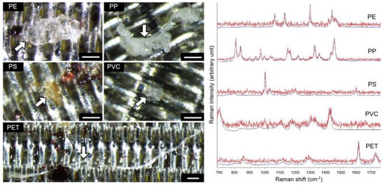 Selected microplastics on stainless-steel sieves with a plain Dutch weave pattern (scale bar: 100 µm), and their Raman spectra (red) compared to the reference spectra of PE, PP, PS, PVC and PET provided in the Renishaw Polymeric Materials Database (blue). Please refer to Figure 1 for the abbreviations of plastic polymers.