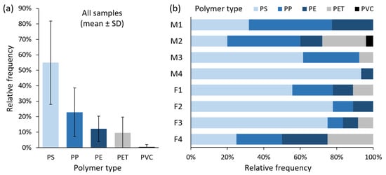 Polymer types of microplastics in (a) all faecal samples (n = 8) and (b) each of the samples, from four men (M1–4) and four women (F1–4), Hong Kong residents. The most abundant type was PS, followed by PP, PE and PET, while PVC was the least common among the samples. Please refer to Figure 1 for the abbreviations of plastic polymers.