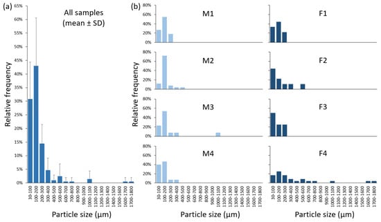 Particle size distribution of microplastics in (a) all faecal samples (n = 8) and (b) each of the samples from four men (M1–4) and four women (F1–4). Particle sizes ranged between 30 and 1800 µm, while microplastics of 30–300 µm accounted for more than 88% of the total number.