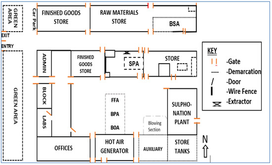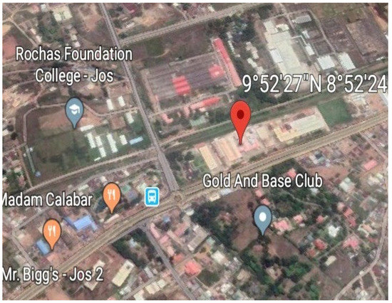 The study area is the detergent unit of NASCO Household Products Limited (NHPL) Jos, located in the Jos South Local Government Area of Plateau State, Nigeria (Figure 1) [16]. It is geographically enclosed within latitude 9°52′27″ N and longitude 8°52′24″ E [17]. NHPL is one of the several distinct business divisions of the NASCO Group of Companies. It was established in 1973 as the detergent, soap, and cosmetic unit of the Group, manufacturing a variety of products as well as industrial chemicals, providing employment and livelihood to hundreds of employees across Nigeria [18,19]. The plant is located 80 m from a busy road, with heavy carriage of assorted vehicles and 2 km from a major stream, which is the water source for irrigation and other agricultural purposes (Figure 2).