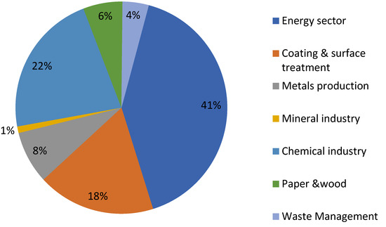 In this research, specific VOCs were not targeted. The values of VOCs obtained followed the trend BPA > BOA > FFA > SPA > BSP, corresponding to concentrations of 1.35, 0.98, 0.93, 0.27 and 0.09 mg/m3, respectively. The BPA with the highest value of VOCs holds a minimum of nine persons at any time of shift. VOCs concentration of 1.35 mg/m3 is high when compared with the Australian National Health and Medical Research Council maximum recommended indoor limit for VOCs of 0.500 mg/m3 [35]. The BPA is where the products are packed into the bags almost directly from the drying tower, during which the volatile compounds are emitted into the workstation. The effect is reflected in the high number of complaints associated with VOCs exposure (Table 2). This goes on to provide indication of future health impacts to workers health and wellbeing aligning with a report that exposure to low levels of VOCs is associated with higher levels of asthma, cancer, and other adverse health effects [36,37,38]. As described earlier, to the south of the area of the BPA is the BOA, and above these two workstations is the FFA. The detection levels for BPA, BOA and FFA were in abundance, with over 37% of the PELs of both OSHA [28] and NESREA [21] of 0.75 and 0.60 mg/m3, respectively. However, the values from this research were found to be lower than those recorded in an earlier finding by Mukurarinda [11], who reported that indoor VOCs concentrations are generally found in higher levels than the ambient outdoor levels and are majorly emitted from building materials, combustion processes, consumer products and personal care products. According to the European Environment Agency, the main sectors involved in high VOCs emissions for the EU-27 are solvent and product use with 41%, followed by the chemical industries (such as NHPL) with 22% as seen in Figure 4. As a household cleaning agent, detergent powder releases VOCs into the indoor environment even in storage, majorly from the constituted perfumes. The extent of the health effects of VOCs depends on factors such as the level of exposure and length of time of exposure; however, immediate symptoms soon after exposure include eye and respiratory tract irritation, headaches, dizziness, visual disorder, and memory impairment [39]. Source removal, source control and natural ventilation in buildings are some of the appropriate approaches that can reduce the risk of hazardous exposure to air pollutants found indoors [28].
