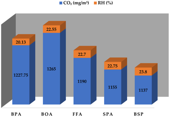 The highest concentration of CO2 was recorded for the BOA of 1265 ± 55.82 mg/m3 with RH of 22.55 ± 0.20%, while the lowest CO2 concentration was recorded for the BSP of 1137 ± 2.00 mg/m3, with the highest value RH of 23.8 ± 0.52%. From the former, it could be deduced that there is a small degree of correlation between the CO2 concentration and the %RH of the workstations, as seen in Figure 5. As the RH concentration increased, the CO2 concentration decreased for the stations.
