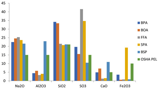 Particulate matter characterization, as shown in Table 5, revealed fifteen (15) components comprising of Na2O, MgO, Al2O3, SiO2, P2O5, SO3, Cl−2, K2O, CaO, TiO2, Cr2O3, Mn2O3, Fe2O3, ZnO and SrO. These values are weight percent concentrations based on three days (each day for 8 h). The concentrations in milligrams per meter cube (mg/m3) obtained for an 8 h TWA for each particulate matter [47,48,49] are provided in Table 5, and the values obtained are compared with OSHA PEL [50] as total dust, metal, or fumes. There are particulates which are neither regulated nor established, for which OSHA has provided a single 8 h TWA PEL of 15 mg/m3 measured as total particulate [50]. From Table 6, MgO, P2O5, Cl−, K2O, TiO2, Cr2O3, Mn2O3, ZnO and SrO are of insignificant concentrations when compared to their OSHA PEL. The remaining Na2O, Al2O3, SiO2, SO3, CaO and Fe2O3 (Figure 6) are of significance and are discussed.