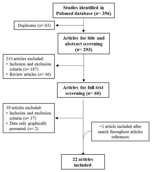 Overall, 356 articles were retrieved from the PubMed search. After removing duplicates, applying selection criteria, and conducting a second search throughout the chosen articles’ references, a total of 22 articles were selected. A flowchart of this selection process is depicted in Figure 2.