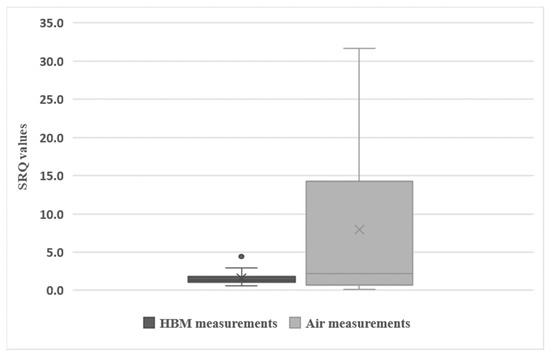 When comparing the results displayed in Table 3 and Table 4 for the same studies, the SRQ obtained using air measurements were significantly higher (about 5-fold higher) than the SRQ determined using HBM data (p = 0.030, Student’s t-test). The distribution of SRQ from air measurements and HBM data (leaving out the high exposure group) is displayed in Figure 3. A much higher variability across studies was observed when considering the SRQ values obtained from air measurements.