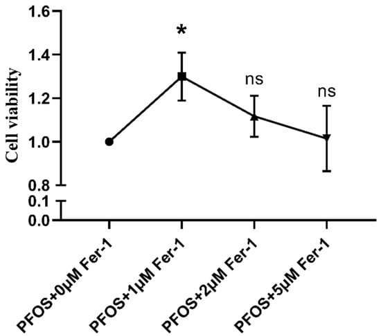 Cell viability after HK-2 cells exposed to PFOS or/and Fer-1. HK-2 cells were exposed to PFOS for 12 h or cultured with Fer-1 for 2 h at the concentration of 0 µM, 1 µM, 2 µM and 5 µM prior to exposure to PFOS and CCK-8 was used to detect the cell viability; the results were from three independent experiments. Cell viability was expressed as mean ± SD (n = 3); * vs. control, p < 0.05; ns—no significant difference.