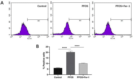 (A) ROS production determined by flowcytometry. HK-2 cells were exposed to PFOS at 200 µM for 12 h or/and cultured with Fer-1 at 1 µM for 2 h prior to exposure to PFOS. The excitation wavelength and emission wavelength were 488 nm and 525 nm, respectively. (B) Comparison of fluorescence intensity in HK-2 cells exposed to PFOS or/and Fer-1. HK-2 cells were exposed to PFOS at 200 µM for 12 h or/and cultured with Fer-1 at 1 µM for 2 h prior to exposure to PFOS; the results were from three independent experiments. Data were expressed as mean ± SD (n = 3); **** p < 0.0001.