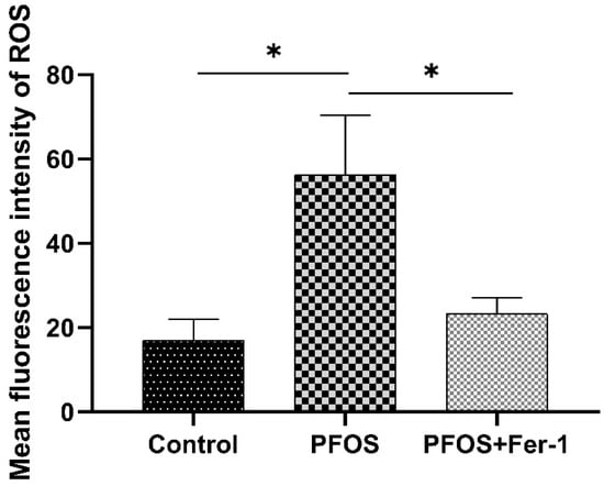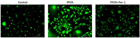 As shown in Figure 3 and Figure 4, PFOS significantly induced the production of ROS in HK-2 cells after the cells were exposed to PFOS for 12 h, and Fer-1 was able to inhibit the ROS production caused by PFOS. The above results indicate that PFOS could induce oxidative stress and Fer-1 could alleviate oxidative stress. Figure 5 and Figure 6 further demonstrate that PFOS could trigger the significant production of ROS and Fer-1 could inhibit the ROS production.