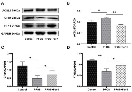 Expression of ACSL4, GPx4 and FTH1 in HK-2 cells exposed to PFOS or/and Fer-1. HK-2 cells were exposed to PFOS at 200 µM for 12 h or/and cultured with Fer-1 at 1 µM for 2 h prior to exposure to PFOS; the results were from three independent experiments. Data were expressed as mean ± SD (n = 3), * p < 0.05, ** p < 0.01, ns—no significant difference. (A) Western blot analysis of ACSL4, GPx4 and FTH1; (B) comparison of ACSL4 expression among control, PFOS and PFOS+Fer-1 group cells. (C) comparison of GPx4 expression among control, PFOS and PFOS+Fer-1 group cells; (D) comparison of FTH1 expression among control, PFOS and PFOS+Fer-1 group cells.