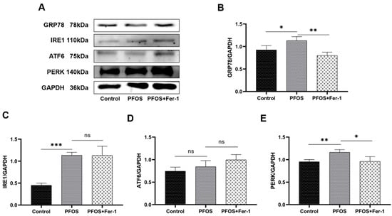 Expression of GRP78, IRE1, ATF6 and PERK in HK-2 cells exposed to PFOS or/and Fer-1. HK-2 cells were exposed to PFOS at 200 µM for 12 h or/and cultured with Fer-1 at 1 µM for 2 h prior to exposure to PFOS; the results were from three independent experiments. Data were expressed as mean ± SD (n = 3), * p < 0.05, ** p < 0.01, *** p < 0.001; ns—no significant difference. (A) Western blot of GRP78, IRE1, ATF6 and PERK; (B) comparison of GRP78 expression among control, PFOS and PFOS+Fer-1 group cells; (C) comparison of IRE1 expression among control, PFOS and PFOS+Fer-1 group cells; (D) comparison of ATF6 expression among control, PFOS and PFOS+Fer-1 group cells; (E) comparison of PERK expression among control, PFOS and PFOS+Fer-1 group cells.