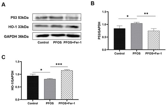 We detected the expression of P53 and HO-1 in HK-2 cells exposed to PFOS to explore the effects of PFOS on the antioxidation. As shown in Figure 9, compared with HK-2 cells from the control group, HK-2 cells from the PFOS group had a significantly increased expression of P53 (p < 0.05). As shown in Figure 9C, there was a decline in HO-1 expression in the PFOS group compared with the control group. Compared with the PFOS group, HO-1 expression was increased in the PFOS+Fer-1 group. The above results suggest that PFOS could inhibit the antioxidant status in HK-2 cells and that P53 is involved in this process. Fer-1 improved these indicators and attenuated the suppression of antioxidation, which is involved in the development of ferroptosis.
