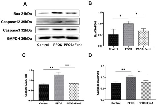 Expression of Bax, Caspase12 and Caspase3 in HK-2 cells exposed to PFOS or/and Fer-1. HK-2 cells were exposed to PFOS at 200 µM for 12 h or/and cultured with Fer-1 at 1 µM for 2 h prior to exposure to PFOS; the results were from three independent experiments. Data were expressed as mean ± SD (n = 3), * p < 0.05, ** p < 0.01. (A) Western blot of Bax, Caspase12 and Caspase3; (B) comparison of Bax expression among control, PFOS and PFOS+Fer-1 group cells; (C) comparison of Caspase12 expression among control, PFOS and PFOS+Fer-1 group cells; (D) comparison of Caspase-3 expression among control, PFOS and PFOS+Fer-1 group cells.