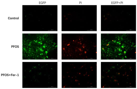 Annexin V-EGFP staining of HK-2 cells exposed to PFOS or/and Fer-1. Normal living cells are not colored by Annexin V-EGFP and PI, cells with early apoptosis are only stained by Annexin V-EGFP and colored green; those stained by PI are dead cells and colored red; necrotic cells and cells with late apoptosis can be stained by Annexin V-EGFP and PI at the same time.