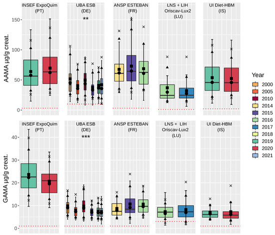 Boxplots of yearly mean (geom. mean, median) AAMA (top) and GAMA (bottom) in adults, based on data (non-smoker) of HBM4EU-aligned studies (Portugal, INSEF-ExpoQuim; Germany ESB; France, ESTEBAN; Luxembourg, LNS + LIH Oriscav-Lux2; and Iceland, Diet-HBM). Box = 25–75% interquartile range; line = median; ■ = mean; ● = geometric mean; ▲ = 10 + 90% quantile; and x = 5 + 95% quantile. Dotted red line: level of quantification (LOQ). Asterisks indicate significant differences in (ln)AAMA and (ln)GAMA in µg/g creatinine (one-way ANOVA), *** , ** .