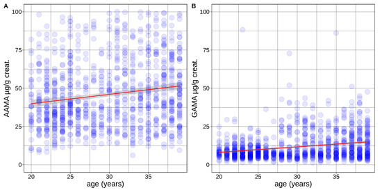 A comparison between 2807 individual children and teenagers (< 19 years) and 1091 adults (>18 years) revealed significantly higher levels of in (ln)AAMA and (ln)GAMA (µg/g creatinine) (AAMA: ; GAMA: ) in children and teenagers as compared to adults (log-transformed data, homogeneous variances, two-sample t-test).