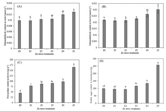 Impacts of different Zn treatments on malonaldehyde content in roots (A), malonaldehyde content in leaves (B), free proline content in leaves (C) and soluble sugar content in leaves (D). Along the x-axis of each graph, Z0, Z1, Z2, Z3, Z4 and Z5 indicate that the Zn concentrations are 0 (or control), 75, 150, 300, 600 and 1000 mg/L, respectively. Vertical bars represent the standard errors of the mean (n = 3). Different letters indicate significant differences among treatments with different Zn concentrations (p < 0.05).