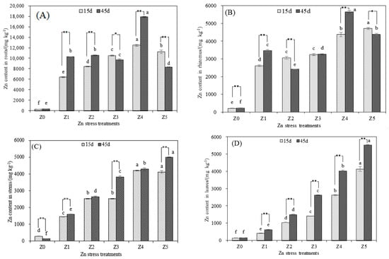 Impacts of different treatment times and Zn treatments on Zn content in roots (A), Zn content in rhizomes (B), Zn content in stems (C) and Zn content in leaves (D). Along the x-axis of each graph, Z0, Z1, Z2, Z3, Z4 and Z5 indicate that the Zn concentrations are 0 (or control), 75, 150, 300, 600 and 1000 mg/L, respectively. Vertical bars represent the standard errors of the mean (n = 3). Different letters indicate significant differences among treatments with different Zn concentrations under the same treatment time (p < 0.05). * indicates a significant difference at 0.05 under the same treatment and different time (p < 0.05). ** indicates an extremely significant difference at 0.01 under the same treatment and different time (p < 0.01).