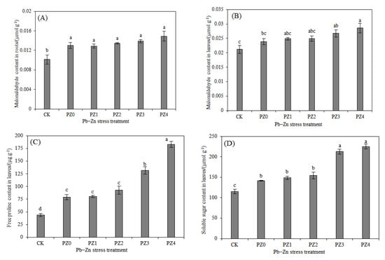 Impacts of different Pb–Zn treatments on malonaldehyde content in roots (A), malonaldehyde content in leaves (B), free proline content in leaves (C) and soluble sugar content in leaves (D). Along the x-axis of each graph, CK indicates that the Pb and Zn concentration is 0 (or control), and PZ0, PZ1, PZ2, PZ3 and PZ4 indicate that the Pb concentration are 300 mg/L and that the Zn concentrations are 0, 75, 150, 300 and 600 mg/L, respectively. Vertical bars represent the standard errors of the mean (n = 3). Different letters indicate significant differences among treatments with different Zn concentrations (p < 0.05).