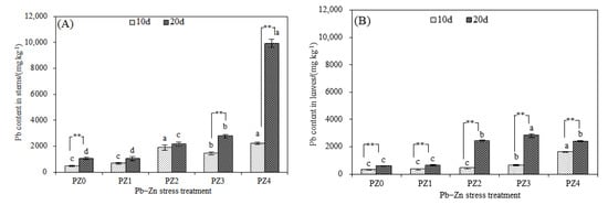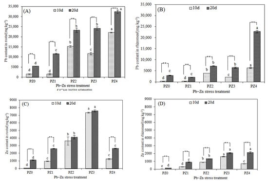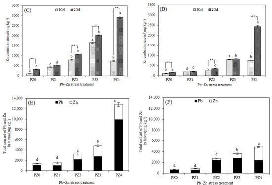 Impacts of different treatment times and Pb–Zn treatments on Pb content in stems (A), Pb content in leaves (B), Zn content in stems (C), Zn content in leaves (D), the total content of Pb and Zn in stems after 20 days of treatment (E) and total content of Pb and Zn in leaves after 20 days of treatment (F). Along the x-axis of each graph, PZ0, PZ1, PZ2, PZ3 and PZ4 indicate that the Pb concentration is 300 mg/L and that the Zn concentrations are 0, 75, 150, 300, and 600 mg/L, respectively. Vertical bars represent the standard errors of the mean (n = 3). Different letters indicate significant differences among treatments with different Zn concentrations under the same treatment time (p < 0.05). ** indicates an extremely significant difference at 0.01 under the same treatment and different time (p < 0.01).