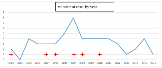 Prevalence curve of deaths (red cross) and cases of acute Rubigine® poisoning in Martinique.