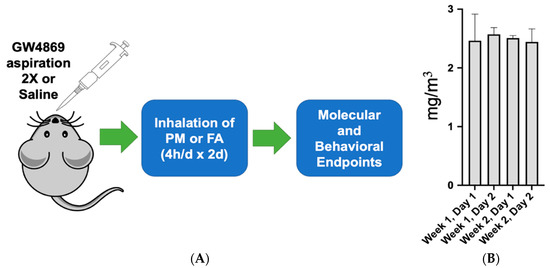 Study design and PM concentration. (A) Mice were subjected to 50 μL of GW4869 (10 μM) or 50 μL of saline via oropharyngeal aspiration the day before and the day of exposure to either FA or PM (2.51 ± 0.08 mg/m3). (B) PM concentration each exposure day (2 days total).