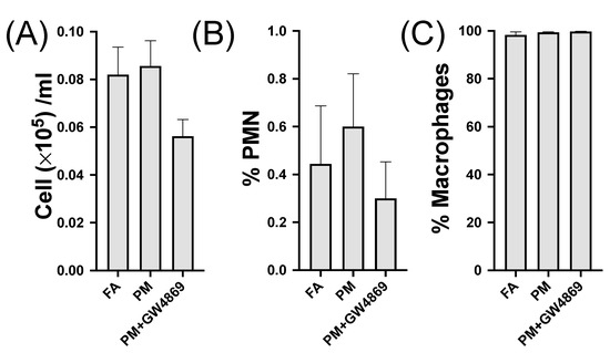 Bronchoalveolar lavage fluid. Cells from lung fluid from FA, PM, and PM + GW4869 inhibitor including (A) total cells, (B) polymorphonuclear neutrophils (% PMN), and (C) macrophages (% macrophages). A one-way ANOVA was performed with a Kruskal–Wallis post hoc test, and p ≤ 0.05 was considered significant. Data represent the mean ± SEM.