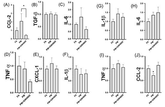 Lung CCL-2 was significantly diminished in the PM exposure group, relative to FA and PM + GW4869 (p = 0.01, Figure 3). Lung gene expression indicated no significant changes in TGF-β, IL-6, TNFα, CXCL-1, and IL-β, according to mRNA RT-qPCR analysis. Genes tested in the right brain whole hemisphere indicated no statistically significant changes in IL-β, TNFα, and IL-6, according to a one-way ANOVA (≤0.05). Interestingly, CCL-2 was significantly diminished in the brain (p = 0.03) following PM exposure and this impact was mitigated via administration of GW4869.