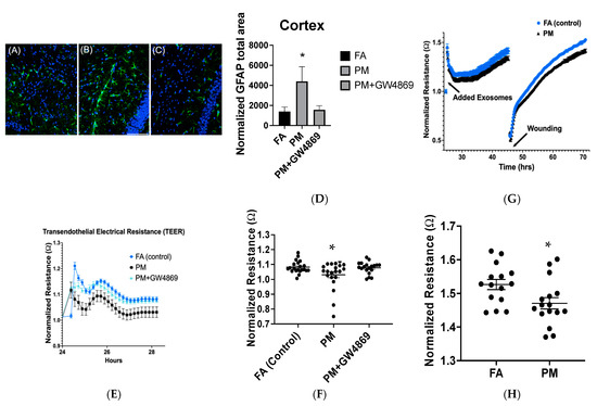 Cerebrovascular integrity. Representative images of brain cortex sections (A–C) stained with DAPI (nuclear staining, blue) and normalized GFAP staining (green) in FA, PM, and PM + GW4869 treatment groups with respective quantification (D). Transendothelial electrical cell impedance sensing (ECIS) in cerebrovascular endothelial cells treated with 5% serum from the aforementioned exposure treatment groups (E,F). There was significant (p = 0.02) diminished resistance in vascular endothelial integrity following serum treatment, suggesting endothelial leakage in the PM group, which was mitigated with GW4869, according to a one-way ANOVA. (G,H) Transendothelial resistance following treatment with solely exosomes and cell culture wounding (scratch assay) with regrowth (p = 0.01). Data are considered significant at p ≤ 0.05, as indicated by the asterisk (*). Data represent the mean ± SEM.