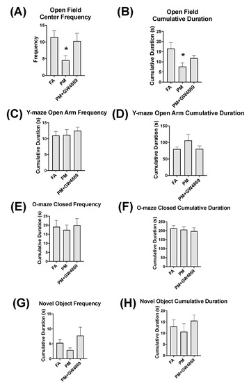 Behavioral tasks. Behavioral tasks were executed following FA, PM, and PM + GW4869 aspiration. These included the open-field test (A,B), Y-maze (C,D), O-maze (E,F), and novel object test (G,H). The open-field test resulted in significantly diminished center frequency visitation (p = 0.0482) and open-field cumulative duration (p = 0.0407). Data represent the mean ± SEM. Data are considered significant at p ≤ 0.05, as indicated by the asterisk (*).