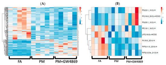 The majority of positive-ion downregulated lipids in the PM, compared to FA, consisted of PC and PE lipids, while a significant number of upregulated lipids in the PM group were triglycerides (TG) (Figure 6). Lipid composition did not change significantly with GW4869 aspiration, and exosome lipid composition remained relatively consistent between PM and PM + GW4869. In a second set of experiments, well-documented toxic metals including As, V, U, Pb, Sb, and Sn that were assessed in isolated BALF exosomes presented either negligible or no detectable level in the FA and PM samples examined (Supplementary Figure S1).