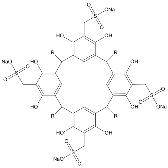- Sanabria, E.; Esteso, M.; Pérez-Redondo, A.; Vargas, E.F.; Maldonado, M. Synthesis and Characterization of Two Sulfonated Resorcinarenes: A New Example of a Linear Array of Sodium Centers and Macrocycles. Molecules 2015, 20, 9915–9928. [Google Scholar] [CrossRef]