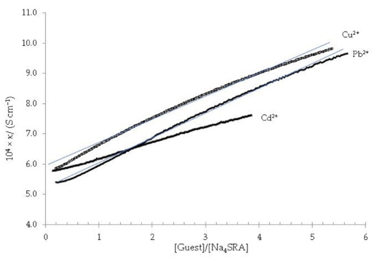 3.5. Complexation of Na4SRA with either Cu2+, Pb2+, or Cd2+