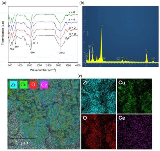 3.3. Fourier Transform Infrared Spectroscopy and Energy Dispersive X-ray Spectroscopy of the Ce3+/Ce4+-Doped ZrO2/CuO Nanocomposites