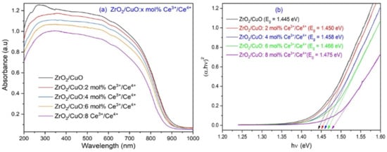 3.5. UV-Vis Absorption Spectrum of Ce3+/Ce4+-Doped ZrO2/CuO Nanocomposites