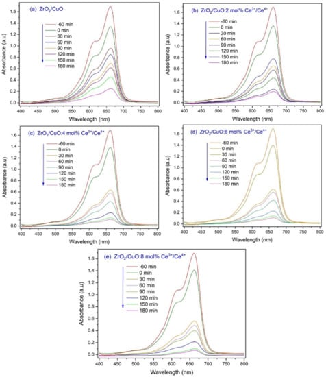 Ce3+/Ce4+-Doped ZrO2/CuO Nanocomposite for Enhanced Photocatalytic Degradation of Methylene Blue under Visible Light