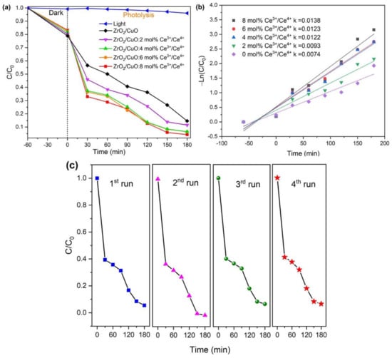 3.6. Photocatalytic Activity of Ce3+/Ce4+-Doped ZrO2/CuO Nanocomposites