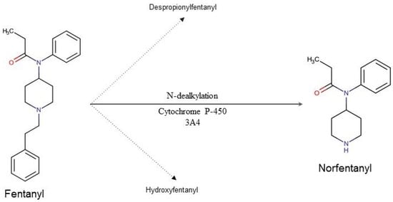 Fentanyl’s metabolic pathway in humans. Ninety-nine percent of the metabolized fentanyl is converted into norfentanyl. The remaining 1% is converted to despropionyl fentanyl and hydroxyfentanyl.