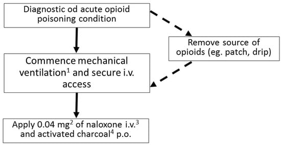 In spite of a fairly characteristic clinical presentation of an opioid toxidrome, fentanyl intoxication may be sometimes difficult to diagnose, even for an experienced clinician (Figure 2). The most important steps in the treatment are: securing patient’s airways, administering the antidote—naloxone—and providing ventilation support if needed. Naloxone is administered in fractioned doses, with the first one being usually 0.4 mg. After administering naloxone, the patient’s condition should be monitored closely for 2–3 min, and in the absence of improvement, the dose should be increased in a gradual way. Special care must be taken when administering naloxone in patients with an opioid addiction. Overdosing naloxone in such individuals may cause a severe opioid withdrawal syndrome, which can be life-threatening.