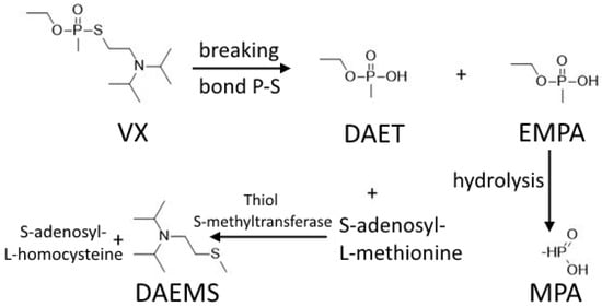 VX metabolic pathway in the human body. VX: N-[2-[ethoxy(methyl)phosphoryl]sulfonylethyl]-N-propan-2-ylpropan-2-amine, DAET: 2-(diisopropylamino)ethanethiol, EMPA: ethylmethylphosphonic acid, MPA: ethylmethylphosphonic acid, DAEMS: 2-(diisopropylaminoethyl)methylsulfide [].