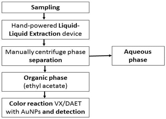 - Takahashi, F.; Kazui, Y.; Miyaguchi, H.; Ohmori, T.; Tanaka, R.; Jin, J. Simple colorimetric screening of the nerve agent VX using gold nanoparticles and a hand-powered extraction device. Sens. Actuators B Chem. 2020, 327, 128902. [Google Scholar] [CrossRef]