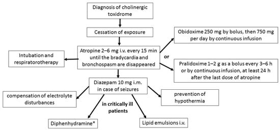 Treatment of poisoning with paralytic and convulsive factors in adults, according to Polish and American standards, is slightly different, but it is absolutely necessary to include atropine and one of the oximes as soon as possible—this combination effectively reduces mortality and long-term effects poisoning (Table 5) [,,,].